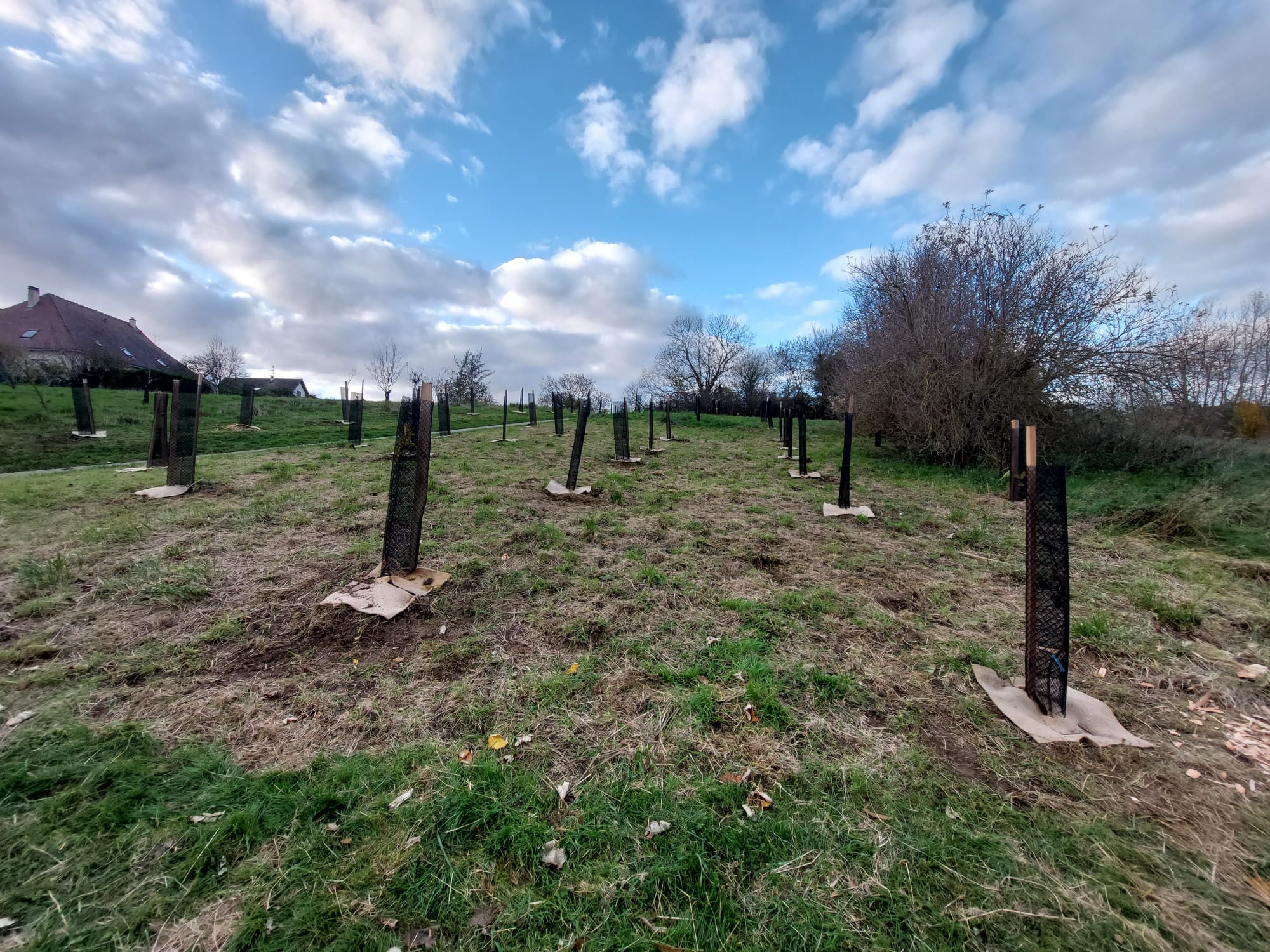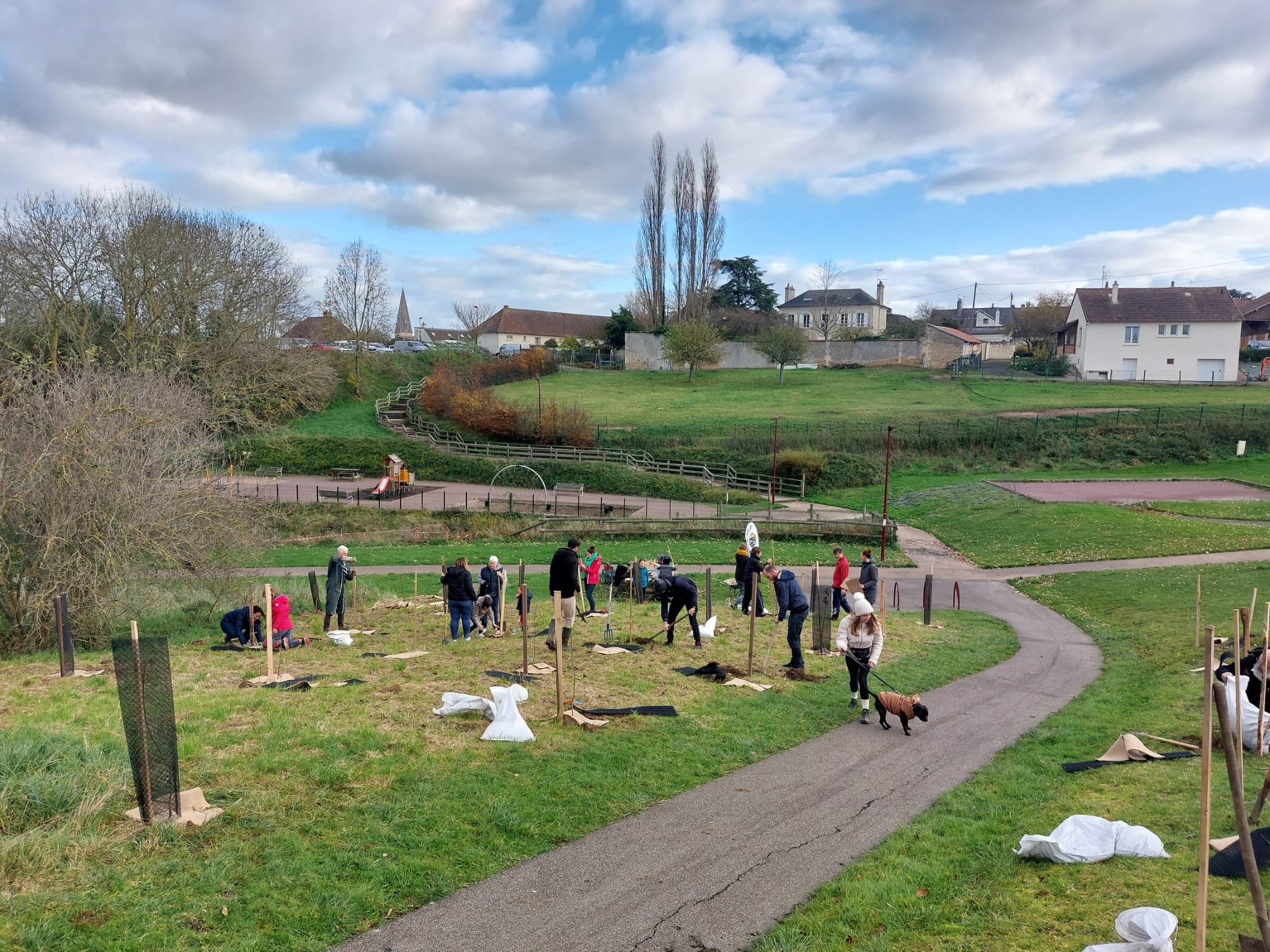 Le samedi 25 novembre, nous avons planté 51 arbres fruitiers dans le parc du vallon à Troarn. Une trentaine de personnes avaient fait le déplacement pour nous prêter mains fortes. C’est sous le soleil que nous avons pu ajouter pommiers, poiriers, néfliers, nashis, cerisiers, pruniers, cognassiers, sorbiers…